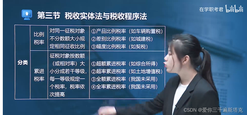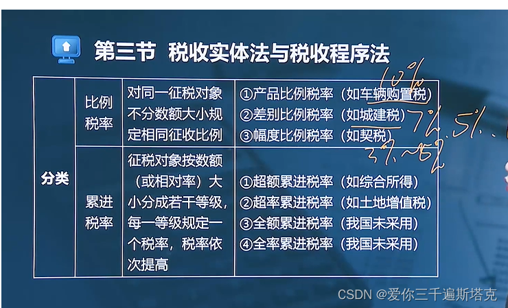 好,这个叫做我们的一个幅度比例税率。那么再来看一下第三类分类,是我们的一个累进税率,那这个累计税率它是指征税对象按照数额大小分成若干等级,每一等级规定一个税率,依次提高,税一次提高。那么这个累进税率我们具体来说又分为是超额累计税率、超率累计税率、全额累计税率、全率累计税率。好,那么后面这两种我们可以直接不用去看,因为在我们国家都没有去采用,我们国家目前采用的就是超额累计税率和超率累计税率。比如说在个人所得税里面的综合所得,我们就是实行一个七级超额累计税率表,然后像土地增值税,我们会使用一个四级的超率累计税率表。