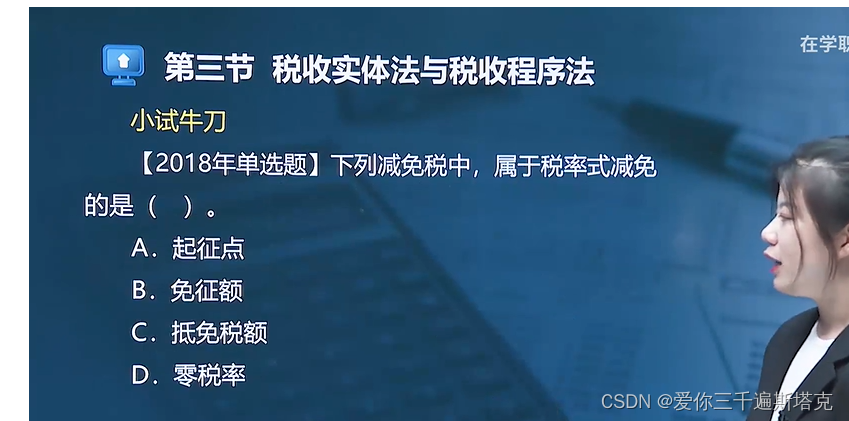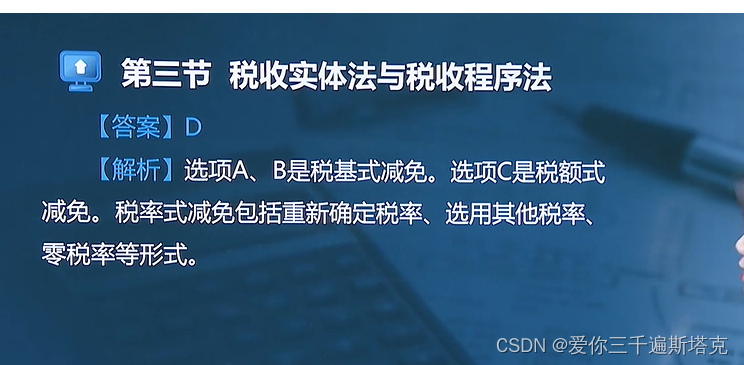 好,那么我们来看一下 18 年指导单项选择题,下列减免税当中属于税率是减免的是什么?好,税率是减免,那么非常简单,答案选的是的选项对不对?好,a、 b 都是税基式减免, c 是税额式减免。税率式减免包括重新确定税率、选用其他税率、零税率等形式。