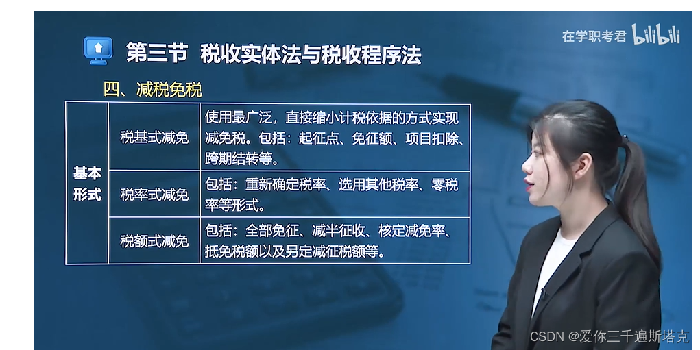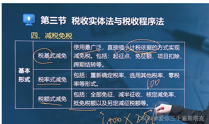 好,它是直接缩小计税依据的方式,以实现我们的减税。免税包括起征点、免征额、项目的扣除、跨期结转等等。好,那么税率是减免,包括重新确定税率,选用其他税率、零税率等形式。比如说企业所得税,我们的法定的企业所得税率是25%,但是像我们的高新技术企业,我们是可以适用 15% 的一个低税率的。好,那么第三类是我们的税额式的减免,税额式减免包括全部免征、减半征收、核定的减免率、抵免税额,以及另行规定这个减征税额等等。好,这个是税额式的抵免。比如说仍然是在企业所得税里面,我们有这么一套优惠政策,如果说纳税人也就这个企业,他购买并且实际使用跟环境保护、节能节水相关的这个专用设备的话,我们可以直接按照设备投资额的 10% 去抵减税额。比如说正常情况下,比如说假设应纳税所得额是 1000 万,好, 1000 万乘以25%,我们正常来说可能应该要交这个 250 万的一个所得税。好,但是我们这个企业他当年有购买跟环境保护、节能节水相关的专用设备,假设设备的购买的金额是 100 万,包含赠是 100 万。