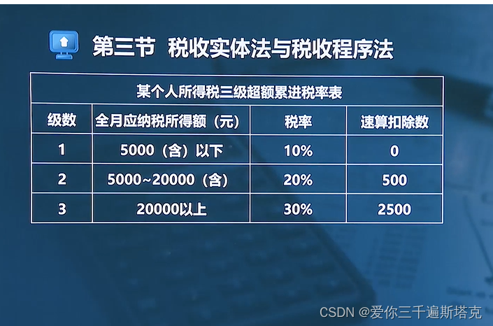 那么如何理解超位累计、超率累计?我们可以往下来看一下这么一个例子,某个人所得税,假设这是一个某个人所得税,一个三级超额累计税率表,好,那么第一级这个全月应纳税所得额是 5000 元以下的,小于等于 5000 元的,我们税率是10%,速算扩读系数是0。第二级, 5000- 2万的税率是 25% 百。然后第三级是你的一纳税所得,如果说是2万以上的话, 30% 的税率是这个2500。