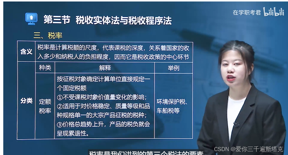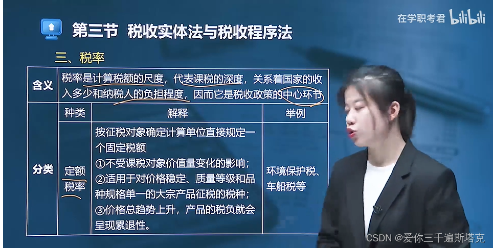 像我们的个人所得税里面最高一档的那个综合所得税税率表是45%,所以你的这个税率越高,那么说明什么啊?说明我们纳税人负担程度也是越高的,因而它是税收政策的一个中心环节。那么在税率这边,我们把这个税率又分成这么几类规定,有定额税率、比例税率和累进税率。