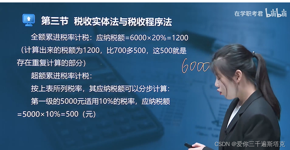 那么我们现在把苏纳库除数给算出来之后,我们应纳税额可以直接用 6000 乘以百分之二十,然后苏纳库除数,就是把我们重复征税的那一部分的金额给扣减掉,那么就减500,所以直接就是700,所以理解了没有什么叫做超额累计税率,什么叫做超额累计税率?那么同学们,你们在学税要的时候,包括在学到这个土地增税的时候,我们还会再一次来运用到这个超额超率的这么一个概念的。