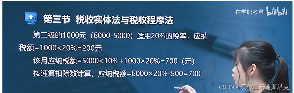那么每一个都用这种方式去算的话,那么是不是会显得非常的复杂,对不对?所以此时我们就引用了一个速算扣除数的问题,相当于我们这 6000 怎么样?6000,我们如果说直接 6000 乘以 20% 的话,那么我们可以算一算 262 是这个1200,对不对?唉,其实前 20% 跟我们按照这个正常的这个超过部分才适用第二级税率的话,这是生产税额是不一样的,发现没有?为什么不一样?就是因为这个 6000 里面有1000,我们本来只要按照 10% 算就可以了,现在你按照 20% 算了,所以我们相当于把你多算的这一部分给扣减掉,那么也就是 1200 再减掉我们 500 的一个速算扣除数,那么就是这个700,所以这个速算扣除数相当于是方便我们计算的这么一个好处,方便我们计算的这么一个好处。
