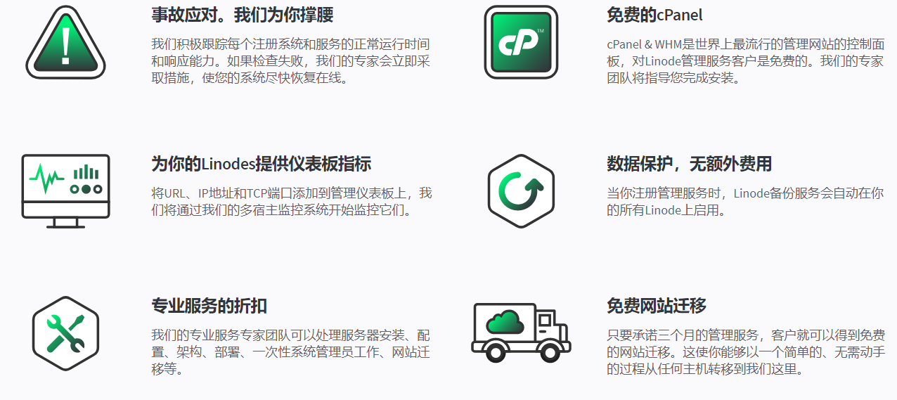 Linode将积极监测您的VPS的正常运行时间和响应性,同时提供cPanel和WHM,网站迁移,以及免费的Linode备份服务。