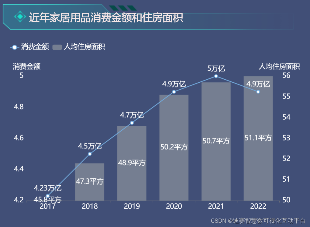 从上图可看出,我国家居用品消费金额和住房面积一直在发展增长,直到2022年,由于疫情原因,影响经济活动,人们收入也有所减少,对购买商品房意愿下降,从而家居用品消费金额和住房面积也受一定程度的影响。