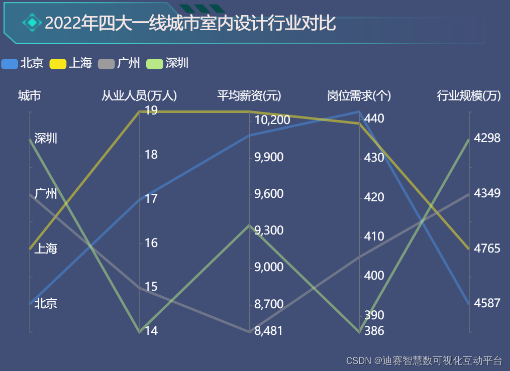 上图数据显示,北上广深在2022年平均薪资分别为10084元、10278元、8481元、9350元左右。从业人员、岗位需求、行业规模方面北京和上海相差不大,上海略强,而广深对于北上相差较多。