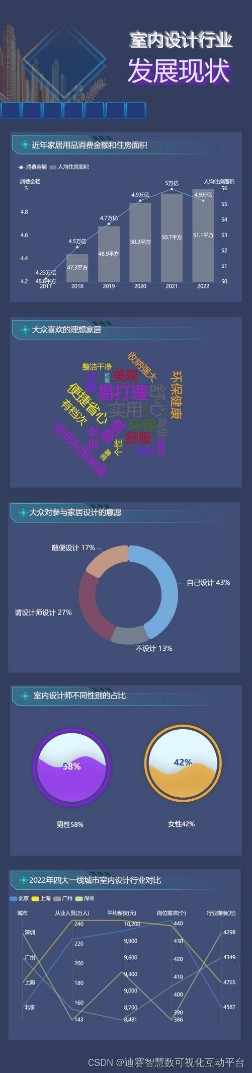 总的来说,我国室内设计行业正处于一个快速发展的阶段,未来还有很大的发展空间,市场需求不断增长,技术应用不断推进,设计师素质和能力也在不断提高,随着科技和生活方式的不断变化,室内设计行业将不断面临新的挑战和机遇。下图是关于我国室内设计行业当前状况的数据大屏。