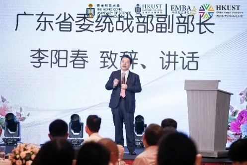 会上,广东省委统战部李阳春副部长发表了热情洋溢的讲话,提出“赋心、赋智、赋能、赋情、赋美”十字真言给大家留下了深刻的印象。他指出,“赋心”就是保持爱国爱港之心、大湾区发展之心,带动粤港两地青年学乃至青年朋友在爱国的旗帜下,共同发展合作事业;赋智是赋予科技智慧之力,发挥港科大的科技之势;“赋能”是赋予发展的动能与潜能,投身于大湾区的发展之中;“赋情”是投入更多的感情为校友、学校、这片土地,同心同情;“赋美”是发现、创造美好,让香港更美、祖国更美、世界更美、让人生更美!致辞中,他高度赞扬了曹志伟主席勇于担当、热衷公益的奉献精神。