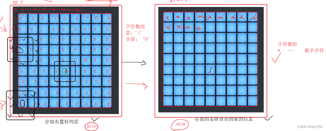 2.不是雷用0表示,是雷用1表示。为了避免与显示雷个数的数字产生矛盾,我们使用两个二维数组,一个存放布置好的雷的信息,一个存放排查出的雷的信息。