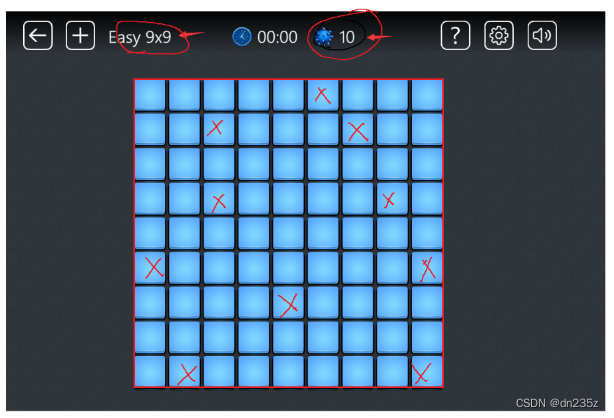{//布置10个雷//生成随机坐标int count = EASY_COUNT;for(count= EASY_COUNT;count>=0;count--){int x = rand() % row + 1;//加1的作用是将随机数的范围从0-8变成1-9int y = rand() % col + 1;if (board[x][y] == '0'){board[x][y] = '1';}}