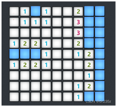 数字代表该坐标周围的8个坐标中存在雷的个数,颜色区域为可能存在雷的区域