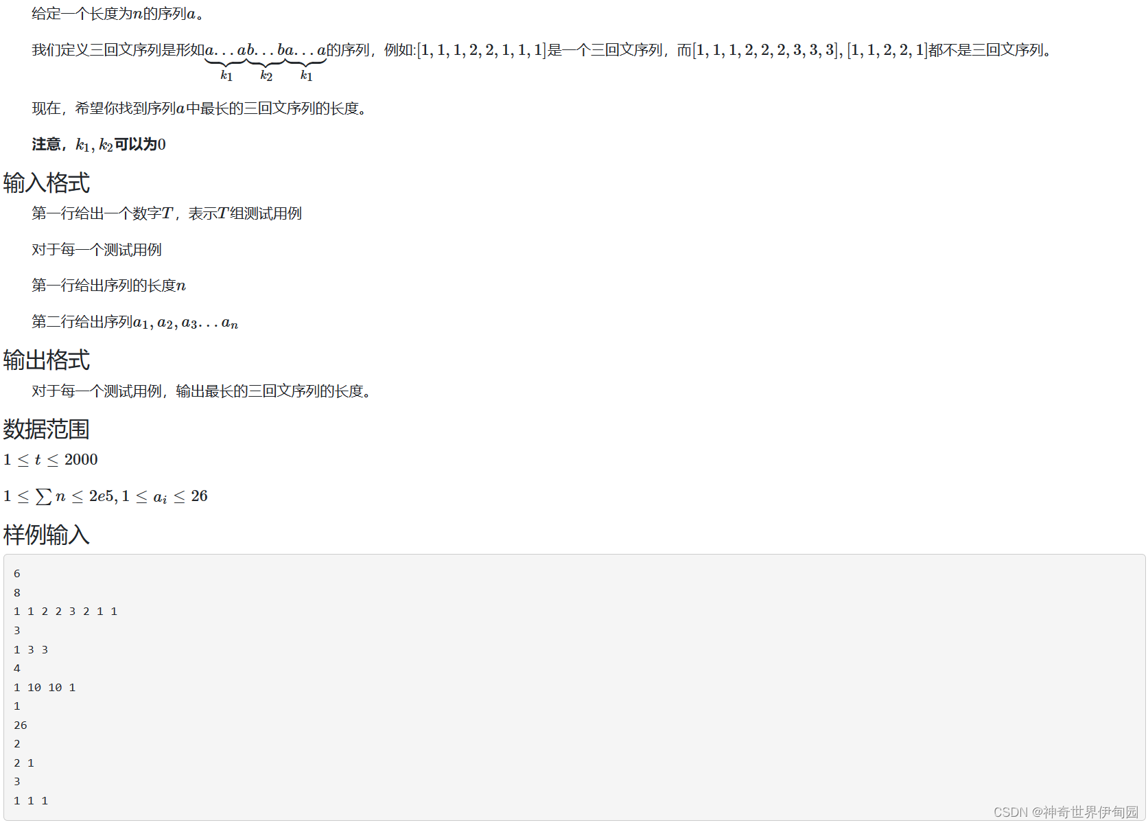 这个题有点难度,由于数值的范围比较小所以可以枚举数据然后匹配。需要记住每个数值第i次出现的位置。然后还有前缀和sum[i][j]表示前i个字符中j字符出现的次数。枚举时首先枚举两边的情况,看看最多出现多少个且不碰到一起,然后再枚举中间的字符,看哪个字符出现的最多。注意二回文序列也是特殊的三回文序列。