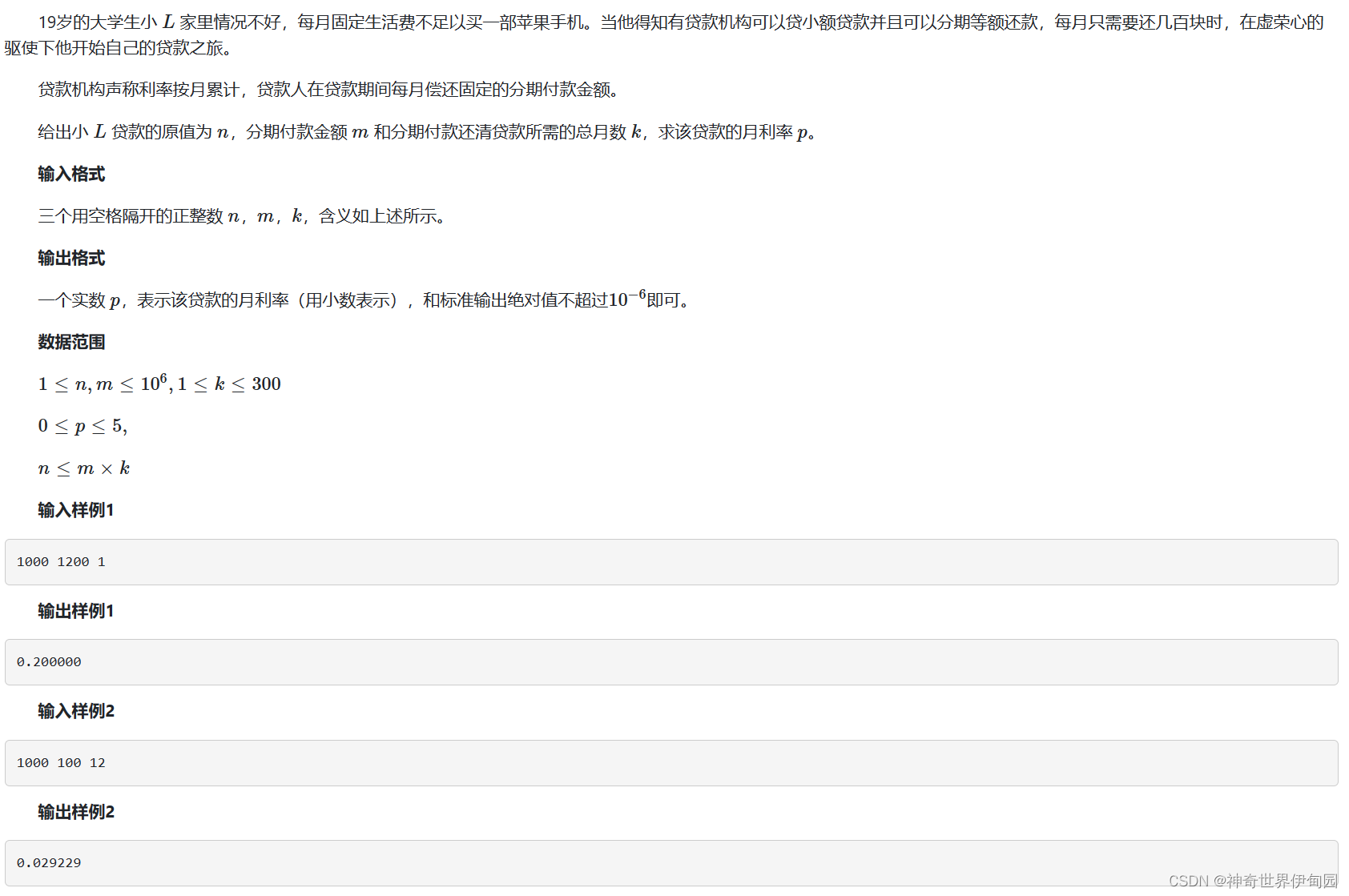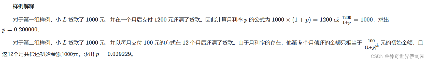 本来以为是数学运算,其实我们只需要根据题意列出方程然后,找到一个解的范围二分法求近似解即可。利率不一定是小于1的(真就高利贷),这个方程也不是很难列。浮点结果运算多半就是二分。和以前周赛的解方程题差不多。