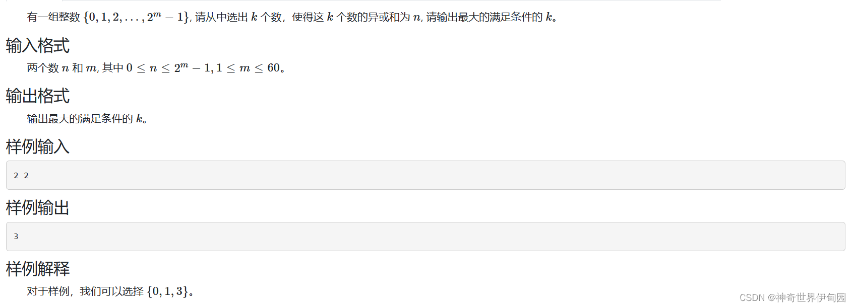 这题的样例具有迷惑性。首先明白的是这样的范围内每个数和他相补的数异或结果为其最大值(比如0和255,1和254) ,转化为二进制是全1,两个全1的数异或就是0,全1的数和其他数异或可以得到自己。所有的数异或起来就是0,但是如果只有2个数(0和1)那么异或起来就是1了。