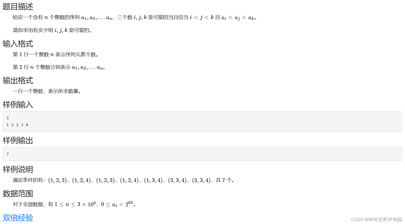 可以通过暴力的算法枚举三个数出现的位置,但不一定要用三重循环, 枚举一个中间点,找比它小的点和比它大的点,然后找到个数做乘积,时间复杂度O(n2),这样比三重循环要好,三元组类型的题都可以这样写。