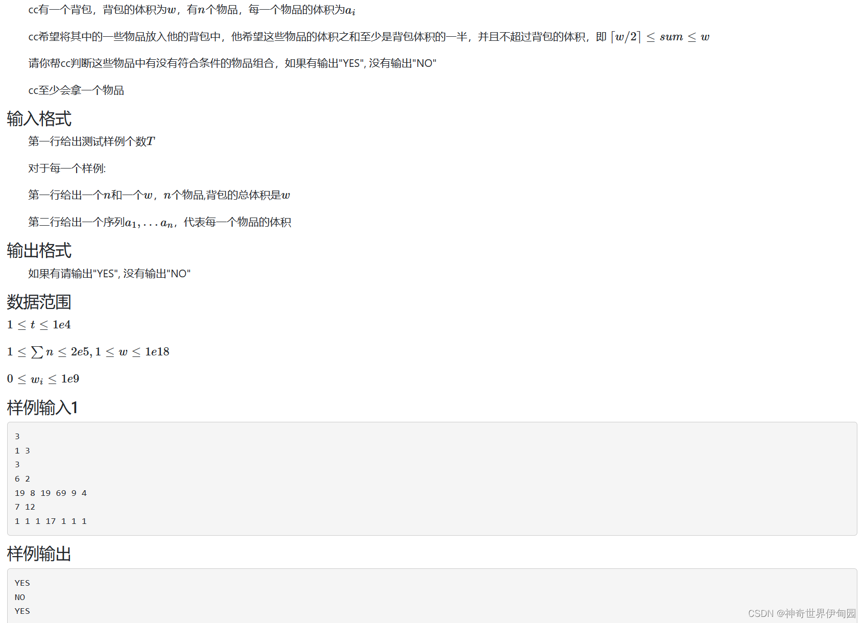 如果背包内存在这样一个物品那么就是true了。如果每个物品都比w大那么就是false了。相反,如果不存在这样一个物品但是存在比w/2小的物品,就逐个累加求和即可。小技巧:向上取整能用(w+1)/2来取代。还有要开long long