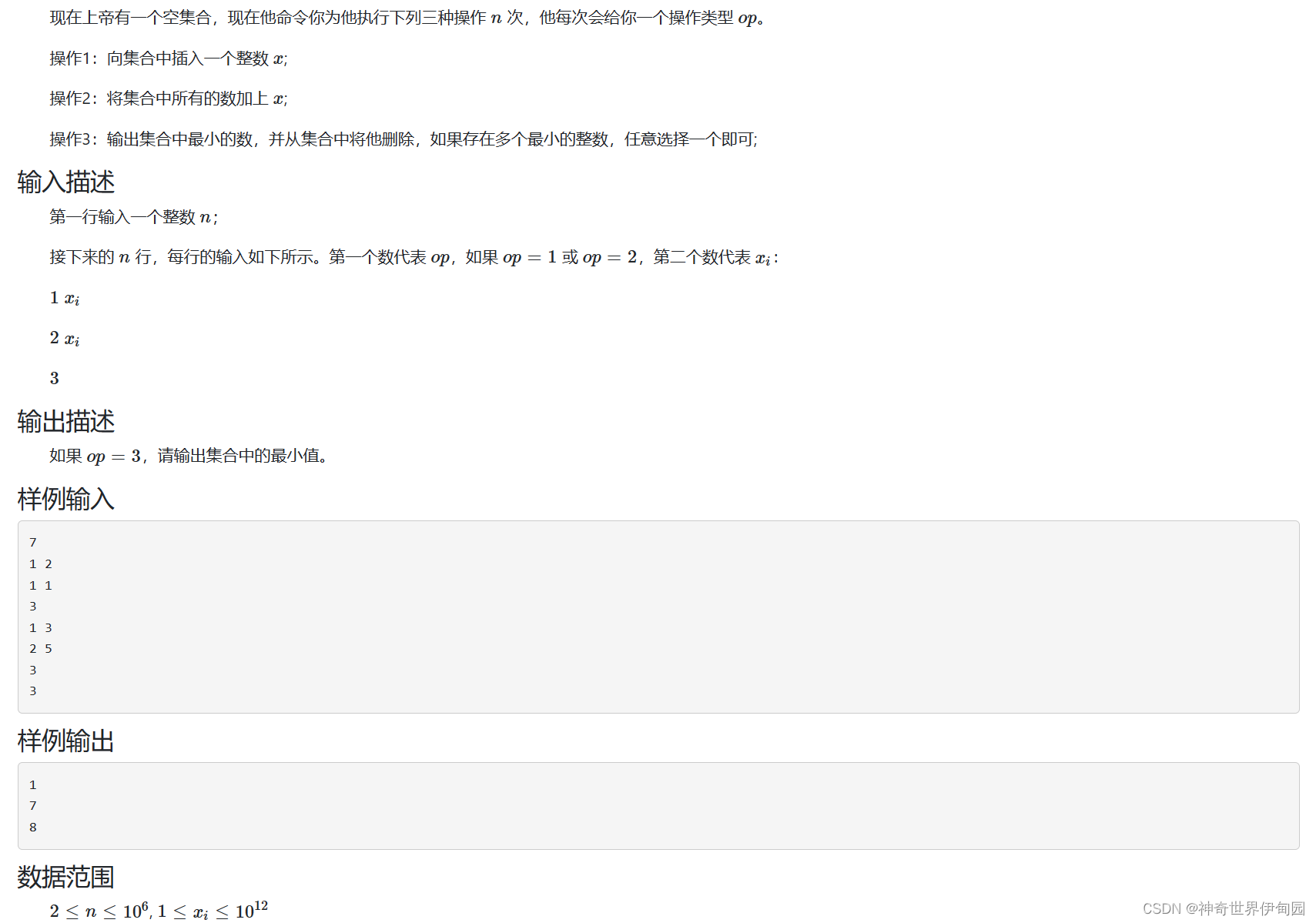 使用multiset来维护集合。我发现multiset的从迭代器访问的第一个元素不一定是最小的,可以使用lower_bound(LONG_LONG_MIN)来得到最小的元素。此外由于可能进行多次加操作,如果加操作每次都对每个元素做可能会超时,所以我们要记住总共加了多少,然后新插入的元素没有进行加操作,所有就相对其他元素是减了。保持每个元素相对值不变即可。此外或许使用map来维护集合。map可以根据键值自动排序,然后记录元素出现的次数。