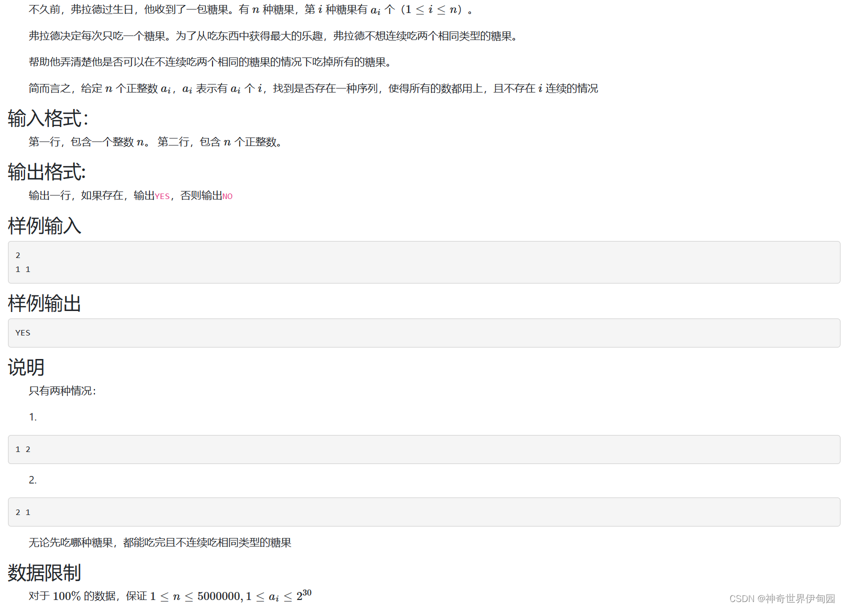 首先吃最多的糖果同时在来吃其他类型的糖果。如果最多的糖果没吃完其他糖果就已经吃完了,肯定是不行的。相反,如果最多的糖果吃完了其他糖果刚好吃完,肯定行。如果最多的糖果没有其他糖果加起来多,可以考虑把其他糖果总数吃的和最多的糖果一样多然后再来吃。比较最多的糖果和其他糖果总和就行,这题算是贪心