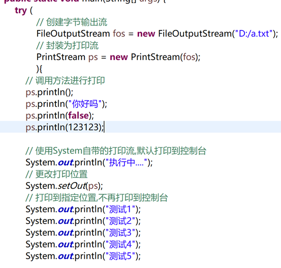 - PrintStream是OutputStream的子类,把一个输出流的实例传递到打印流之后,可以更加方便地输出内容,相当于把输出流重新包装一下