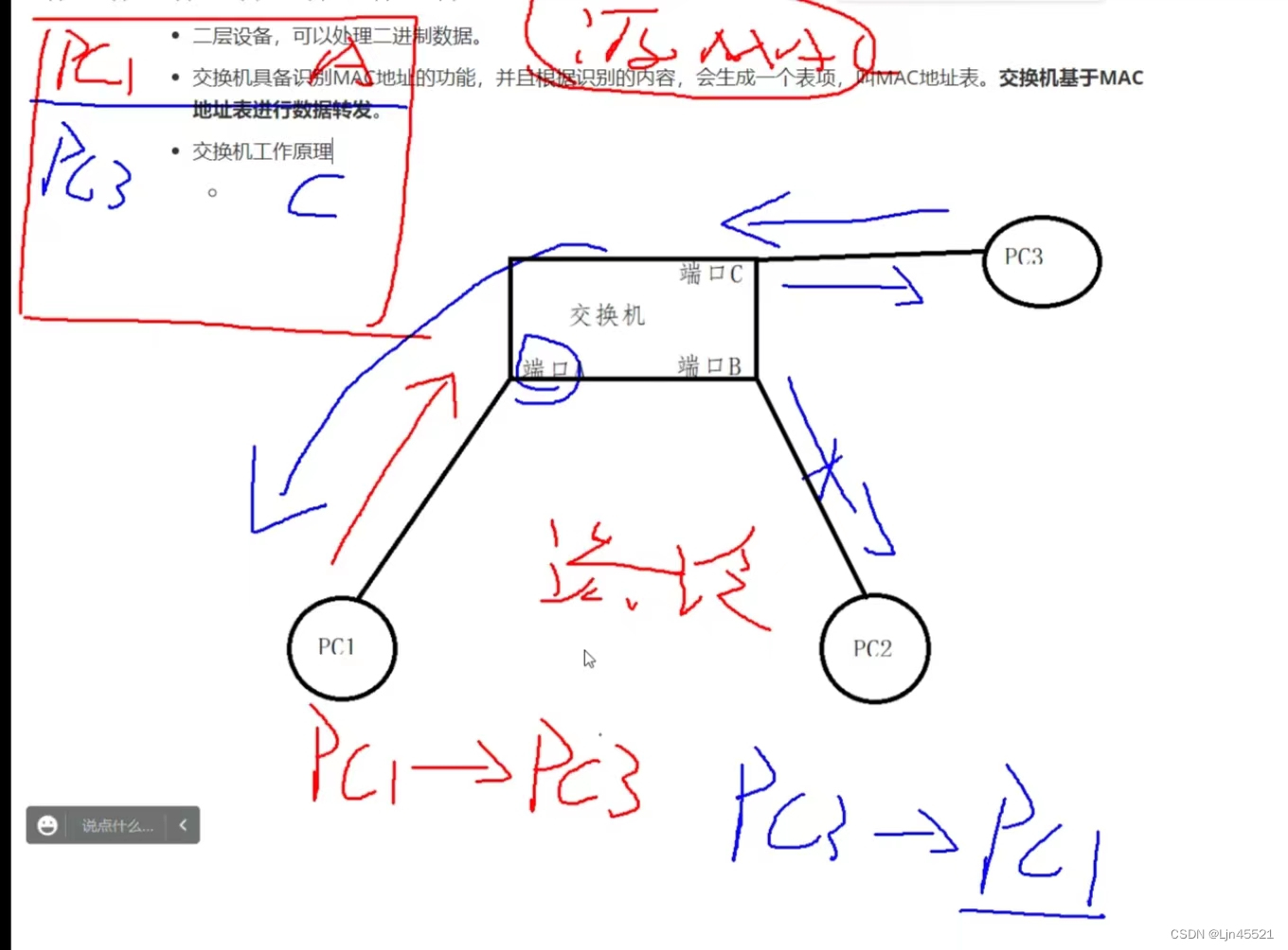 1.PC1给PC3发送信息,此时源MAC=PC1,目的MAC=PC3.
