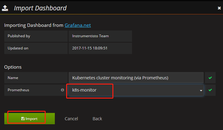 spec:rules:- host: k8s.grafanahttp:paths:- path: /backend:serviceName: grafanaservicePort: 3000 第四步:在k8s-master节点上进入/k8smonitor目录依次执行以下命令部署grafana: