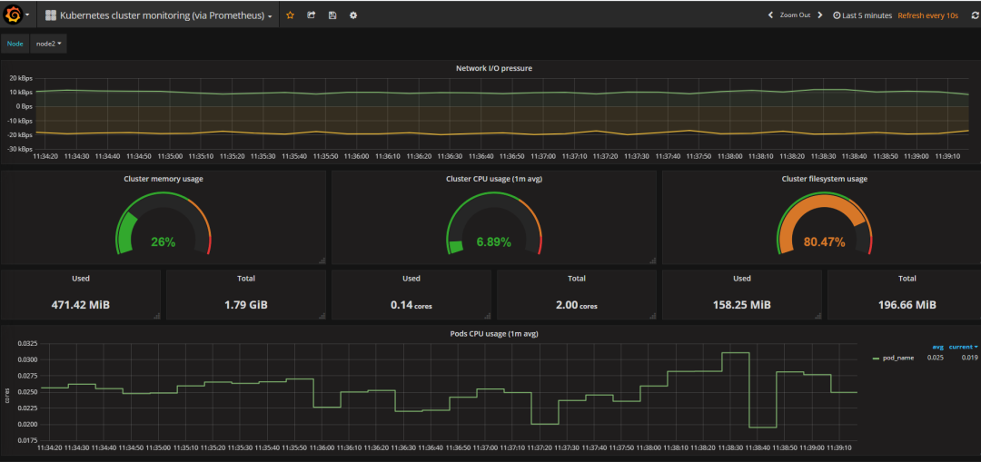 简而言之,这里我们选择Grafana的作用就是从Prometheus中读取数据,生成报表的形式进行数据可视化的功能。搭建完成后的效果图如下: