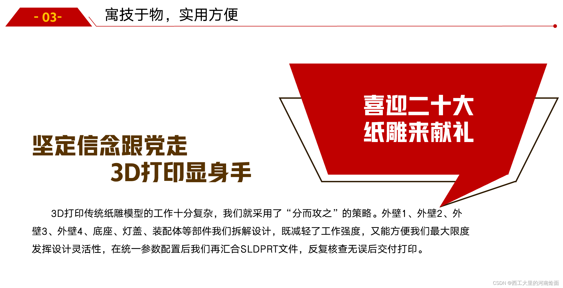 1 拆解思维——比如有一支队伍做的是红船的模型,设计原型拆解为 船底、顶棚、船顶。拆开打印再进行组装。我们队伍的喜迎二十大纸雕灯也是采用了拆解结构的做法。具体介绍如下: