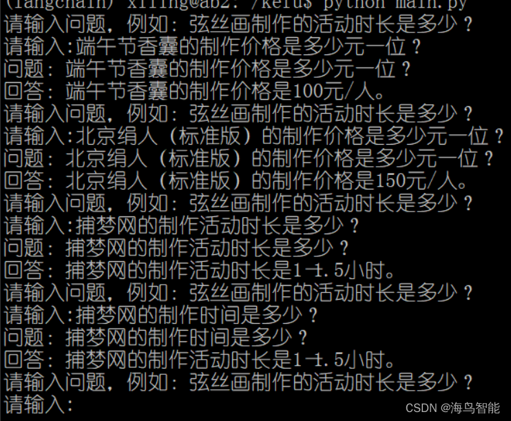 while True:print("请输入问题,例如:弦丝画制作的活动时长是多少?")query = input("请输入:")if "end" == query:breakquestion = queryprint(f"问题:{question}")