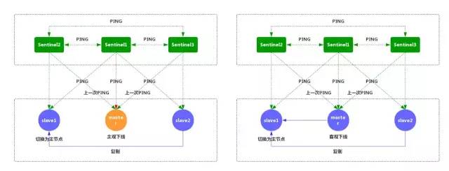 ①每个 Sentinel 节点都需要定期执行以下任务:每个 Sentinel 以每秒一次的频率,向它所知的主服务器、从服务器以及其他的 Sentinel 实例发送一个 PING 命令。(如上图)