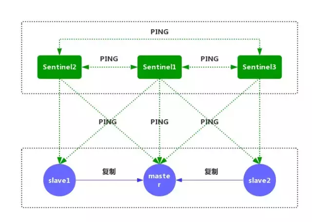 ①每个 Sentinel 节点都需要定期执行以下任务:每个 Sentinel 以每秒一次的频率,向它所知的主服务器、从服务器以及其他的 Sentinel 实例发送一个 PING 命令。(如上图)