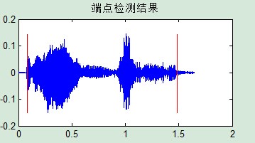 图3.8和图3.9分别是“电子”的训练语音电子.wav和“北海”的训练语音北海.wav的端点检测结果,红线之间的部分为检测出的语音有声段。