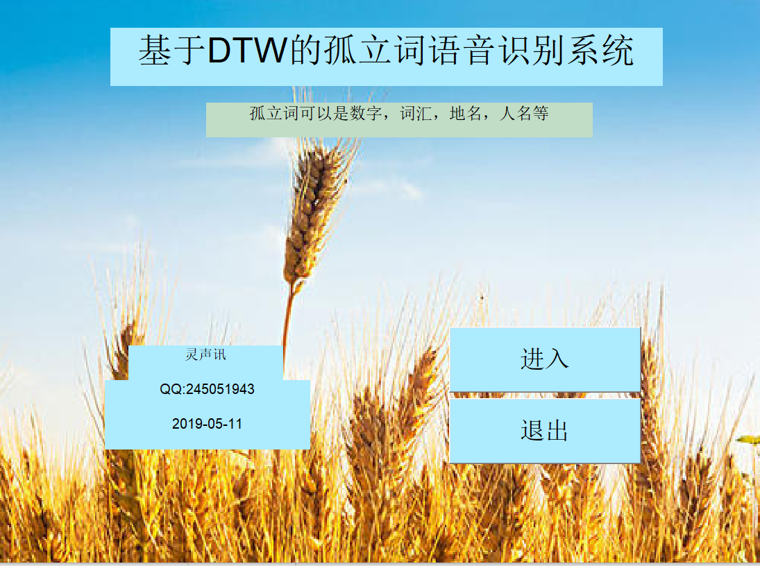 初始界面主要设计4个部分,包括题目、背景图片、进入按钮和退出按钮。题目采用静态文本设计,背景图片采用外部图片导入。初始界面如图4.1所示。点击“进入”按钮进入孤立词识别系统,退出按钮包含交互式对话框,确认后退出整个MATLAB程序。