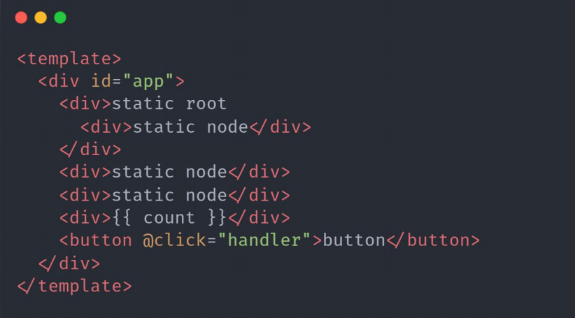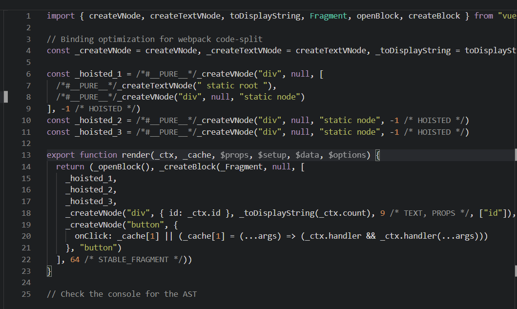 我们能看到 _hoisted_1、_hoisted_2、_hoisted_3 这样的静态节点被提升到了 render 的外层,这样只有在页面初始化的时候会创建一次,下次视图重新渲染后直接引用静态节点即可,这样的静态节点也不会参与 diff 的过程。