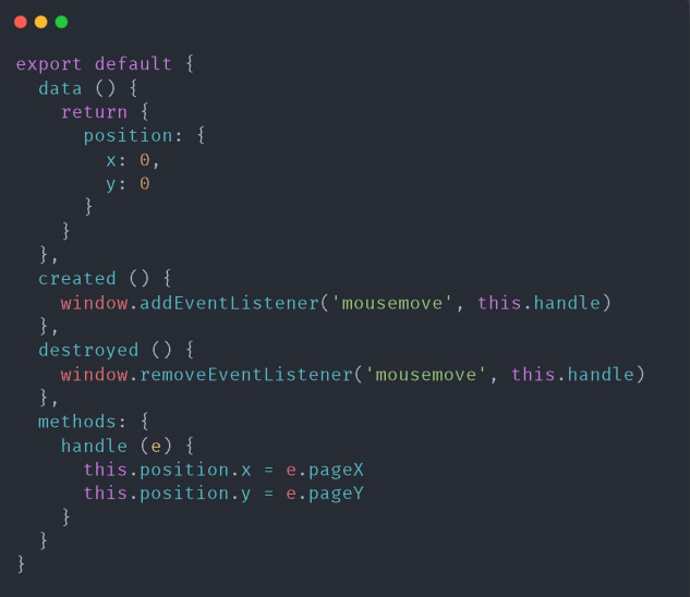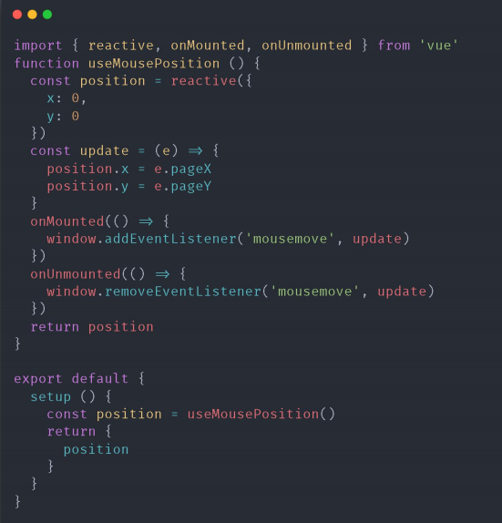 上面的代码我们可以看到,我们将所有重复的功能都封装在 useMousePosition 这个函数中,当我们需要使用的时候,我们只需要在 setup 这个函数中去调用即可。这样我们在查看某个逻辑的时候,只需要查看某个函数即可,不用再在各个 option 中来回查找了。