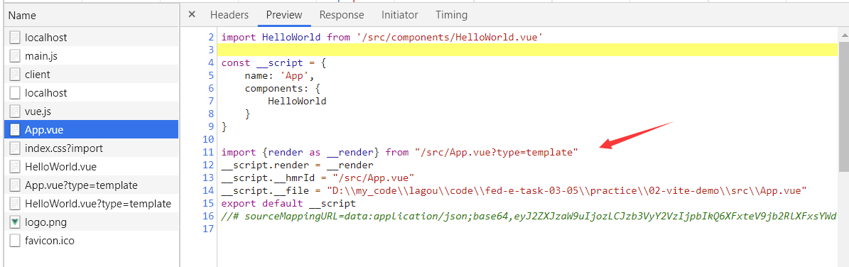 我们再来看看控制台 netWork 请求到的 App.vue 的解析结果