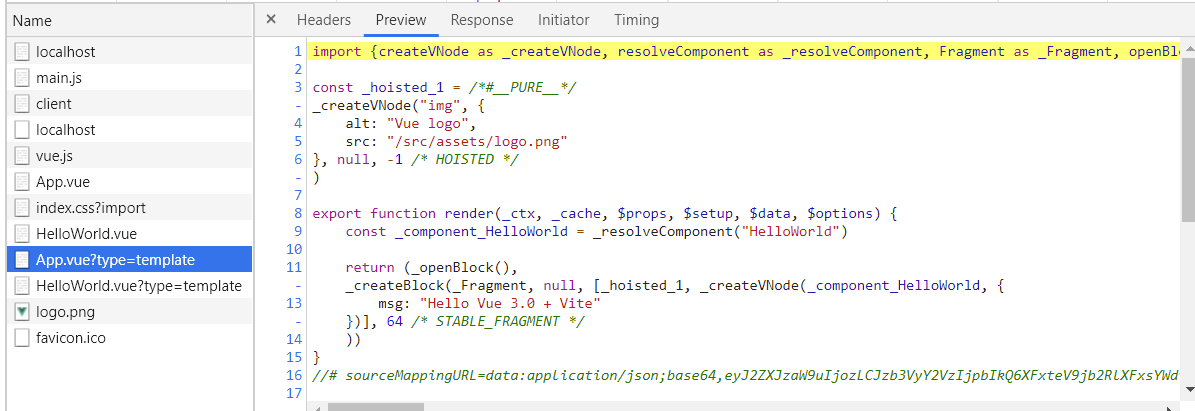 这次我们来看看 App.vue 又被请求了一次,不同的是这次带了一个 type=template 的参数,这次请求服务器之后,服务器会把 App.vue 这个单文件组件通过 Vue3.0 中的模块 compiler-sfc 给编译成 render 函数,这基本就是 Vite 的工作原理。