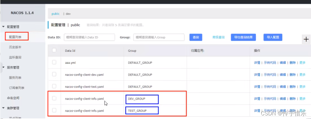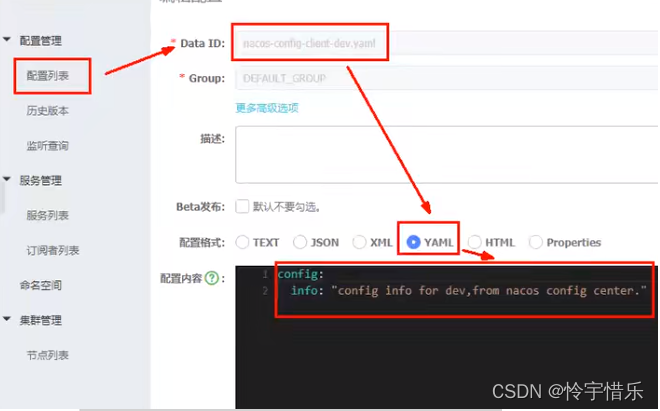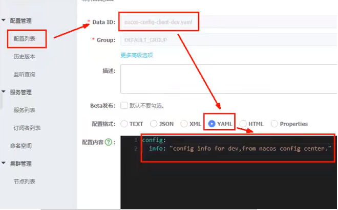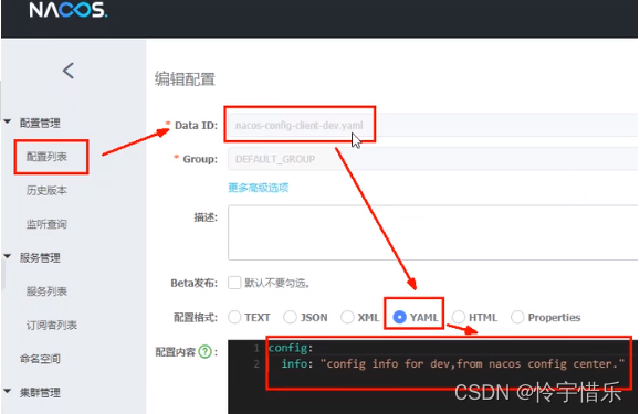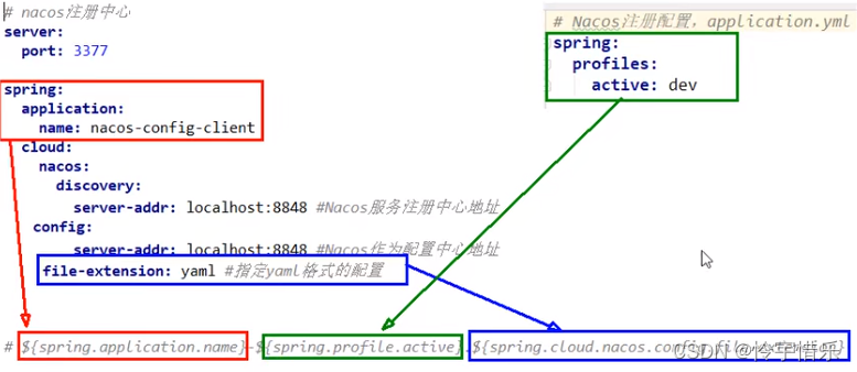 server:port: 3377spring:application:name: nacos-config-clientcloud:nacos:discovery:server-addr: localhost:8848 #Nacos服务注册中心地址config:server-addr: localhost:8848 #Nacos作为配置中心地址file-extension: yaml #指定yaml格式的配置group: DEV_GROUPnamespace: 7d8f0f5a-6a53-4785-9686-dd460158e5d4 #<------------指定namespace# ${spring.application.name}-${spring.profile.active}.${spring.cloud.nacos.config.file-extension}