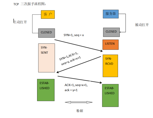 第一次握手:建立连接时,客户端发送SYN包(syn=j)到服务器,并进入SYN_SNED状态,等待服务器确认