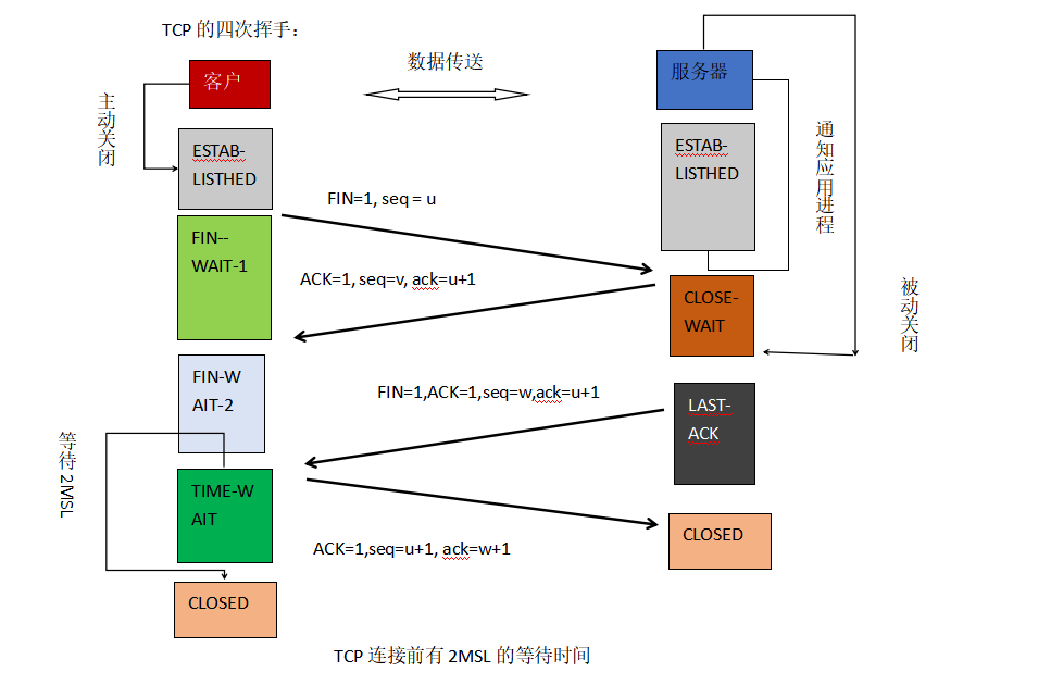 第四次挥手:Client收到FIN后,Client进入TIME_WAIT状态,接着发送一个ACK给Server,确认序号为收到序号+1,Server进入CLOSED状态,完成四次挥手。