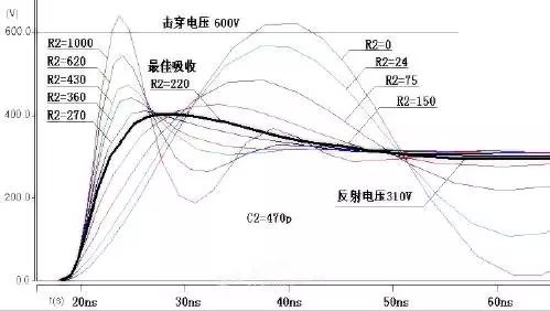 ● 对应一个特定的吸收环境和一个特定大小的电容C,有一个最合适大小的电阻R,形成最大的阻尼、获得最低的电压尖峰。