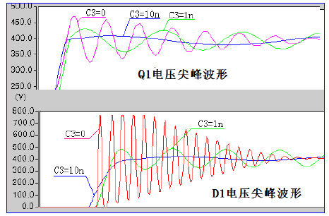 ● 同时将Q1、D1的电压尖峰、振铃减少到最低程度。