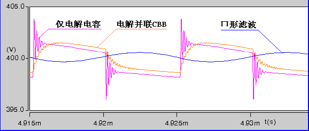 ● 提出的办法是:用电感将电解和CBB分开,CBB位于高频纹波电流侧,电解位于直流(工频)侧,各自承担对应的滤波任务。