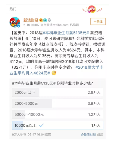 据媒体报道,近日麦可思研究院和社会科学文献出版社共同发布年度《就业蓝皮书》,其中提到:根据调查,2018届大学毕业生月收入为4624元,本科毕业生月薪为5135元,而城镇居民2018年月均可支配收入为3271元。