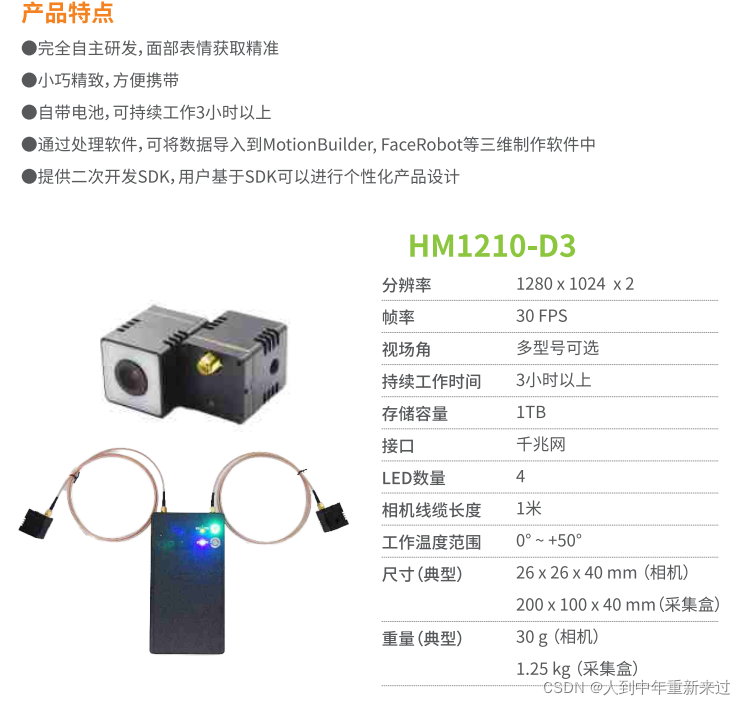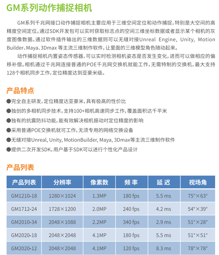 动作捕捉可以参考欧比邻·奥视得倍的GM系列动作捕捉相机的型号参数,面部表情捕捉可以参考HM1210-D3这个型号的动捕相机。