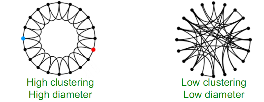 在介绍生成方法之前,需要介绍两种图:高聚合系数图和低直径图。在高聚合系数图(下图左)中,每个节点都于左右第二个节点相连来产生本地结构,得到了高聚合系数,但图的半径也很大;在低直径图(下图右)中,每个节点都随机与其他两个节点相连接来产生随机网络,得到了低直径,但聚合系数也很高。