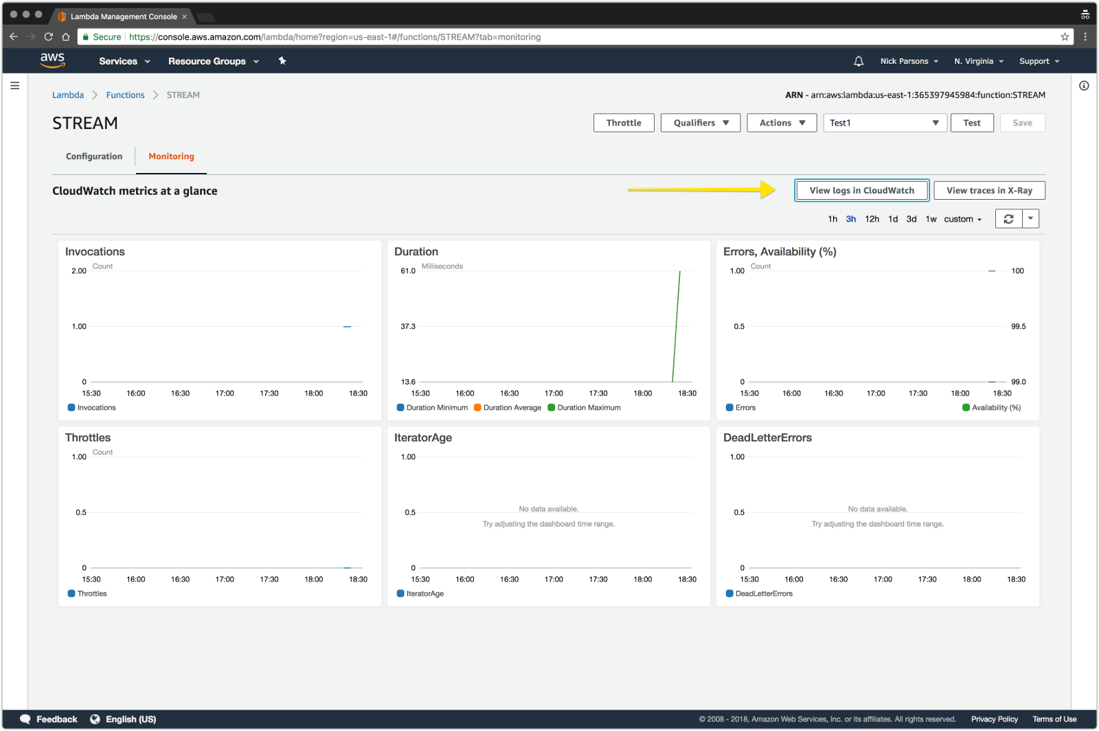 成功保存Lambda代码后,需要单击“监视”,将您带到另一个页面。 重定向后,单击“在CloudWatch中查看日志”。