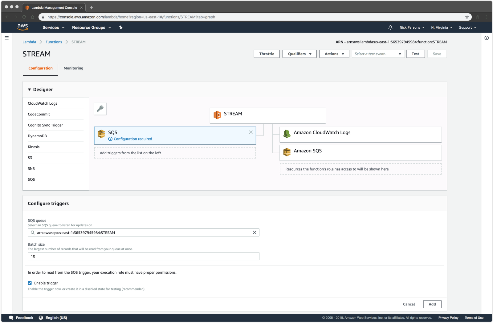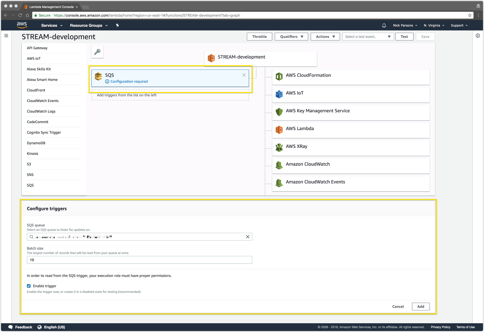 - 在“配置触发器”部分中,搜索您的SQS队列(在我们的示例中,它将被命名为“ STREAM”)