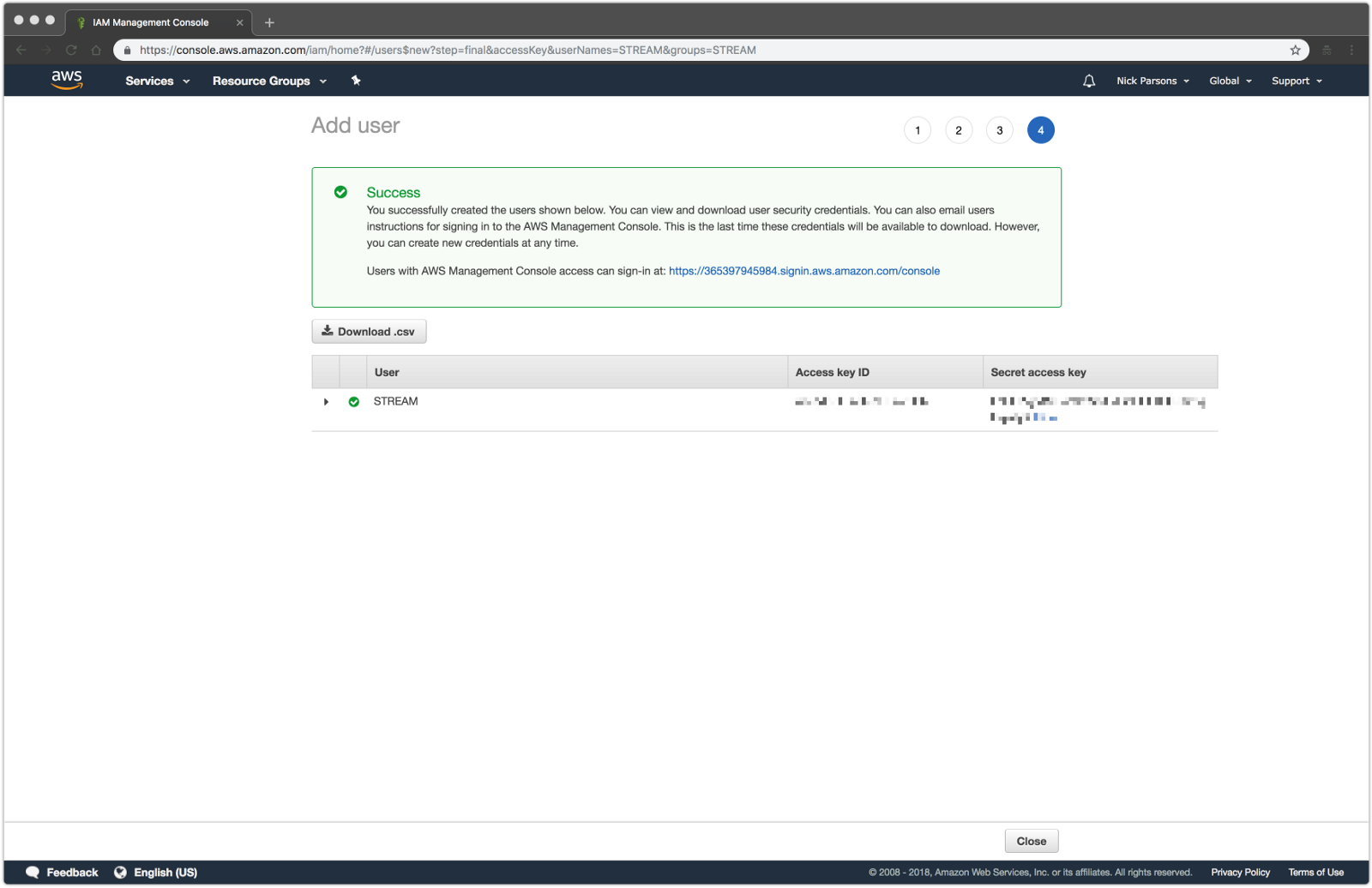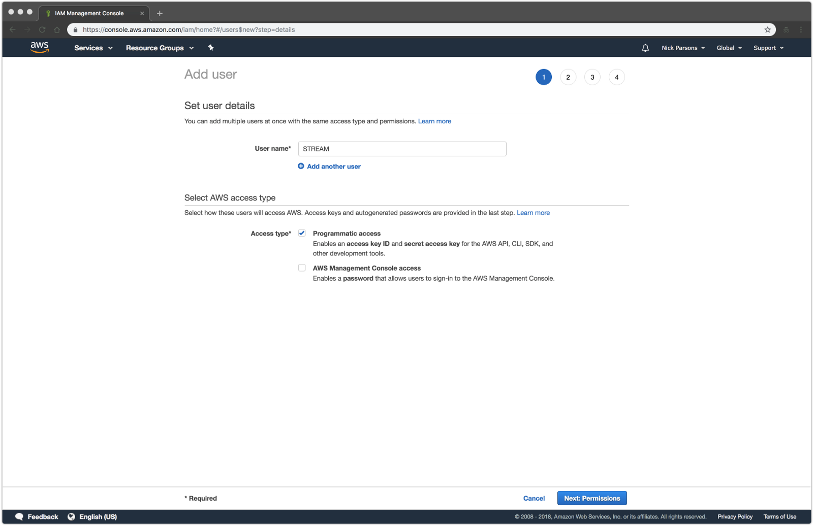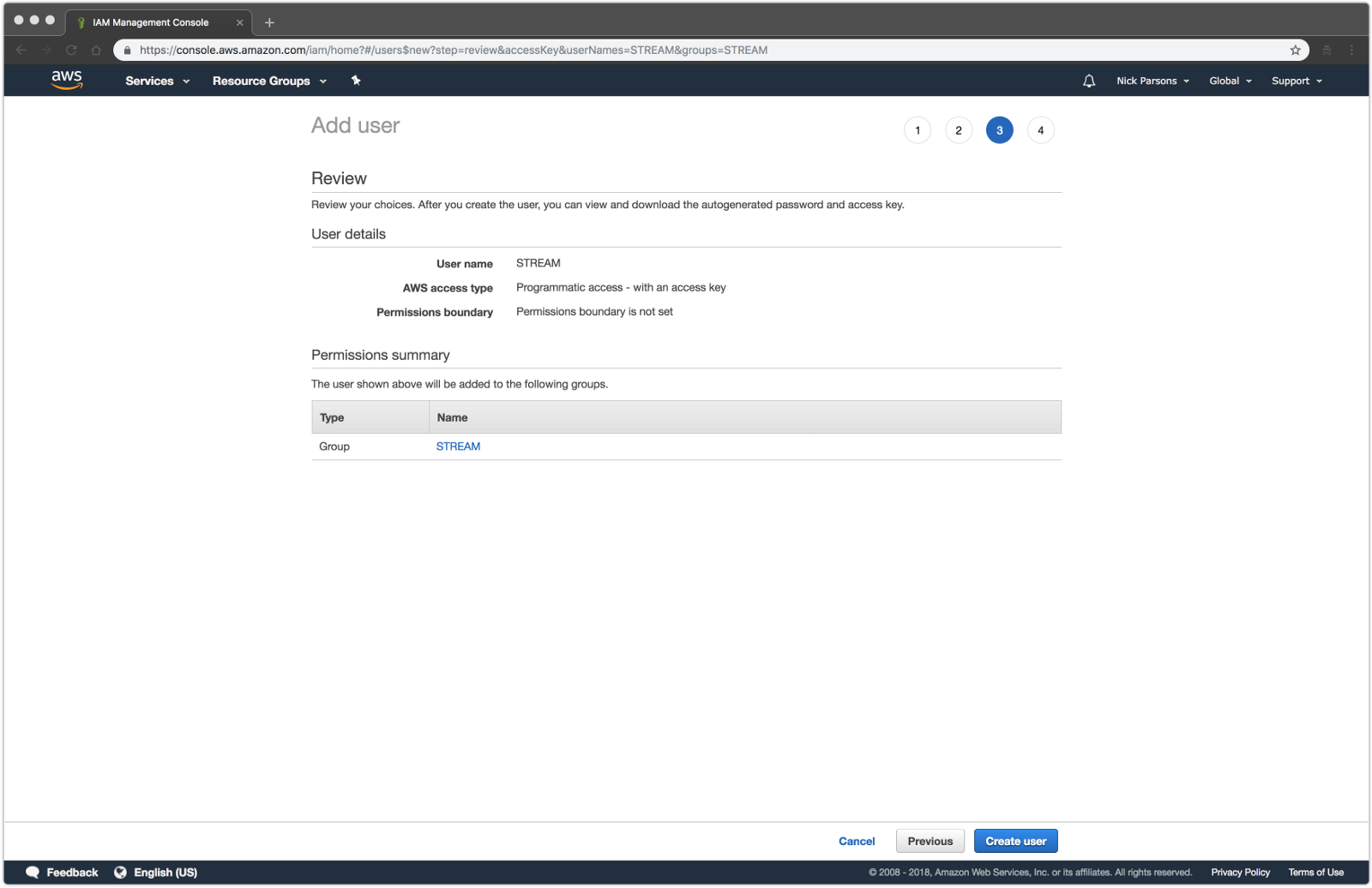 在开始之前,我们需要为Stream创建一个用户。 我更喜欢创建一个单独的用户,以便可以更改权限。 但是,您可以根据需要随意使用现有的密钥和机密(如果是这种情况,只需跳过本节的第一部分)。