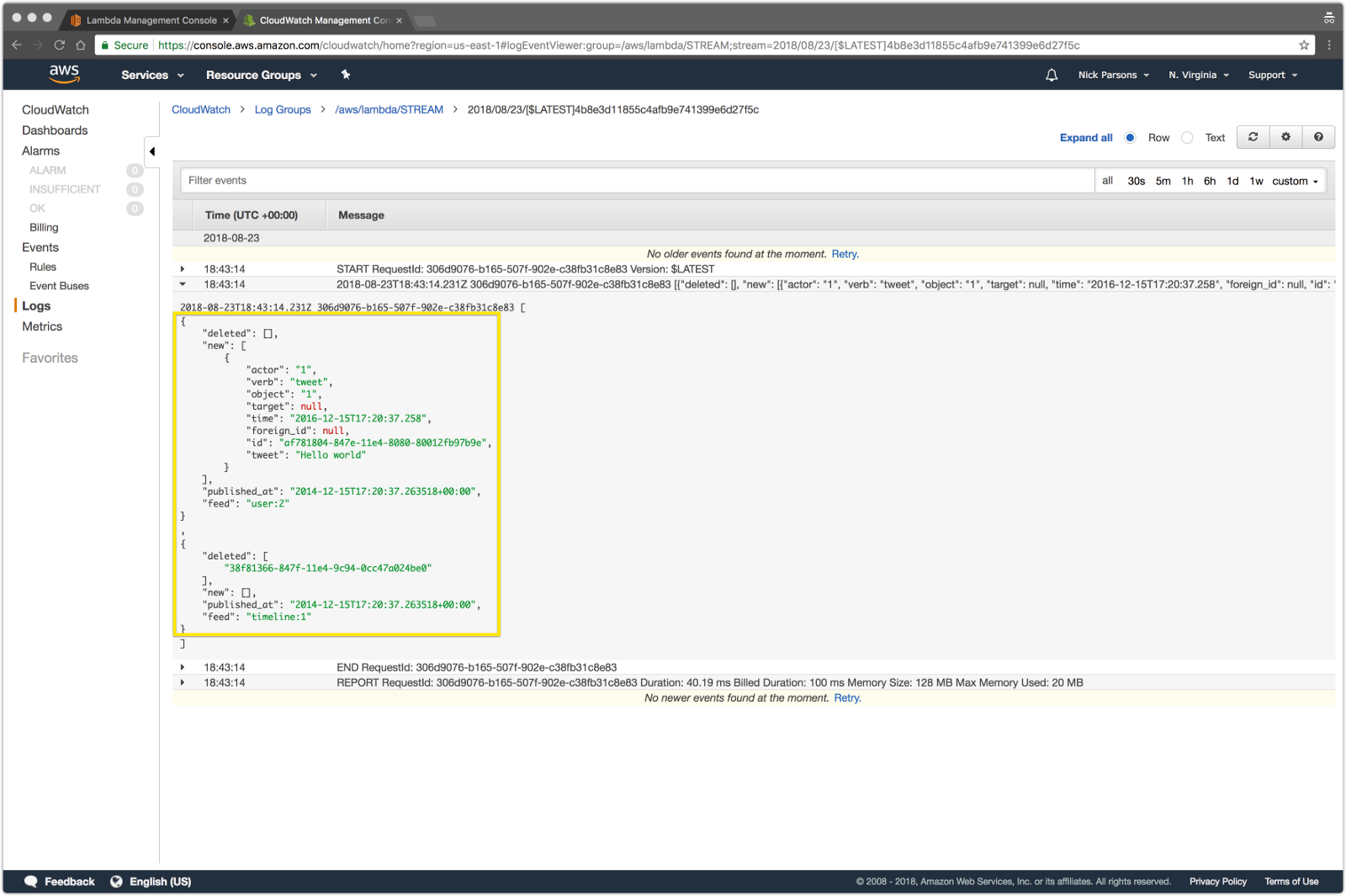 您应该在有效负载中看到的是一个tweet活动的示例活动(上面显示的示例)。 如果CloudWatch中未显示任何内容,请尝试重新加载。 如果这不起作用,请再执行一次以上概述的步骤,以确保您已选中每个框。