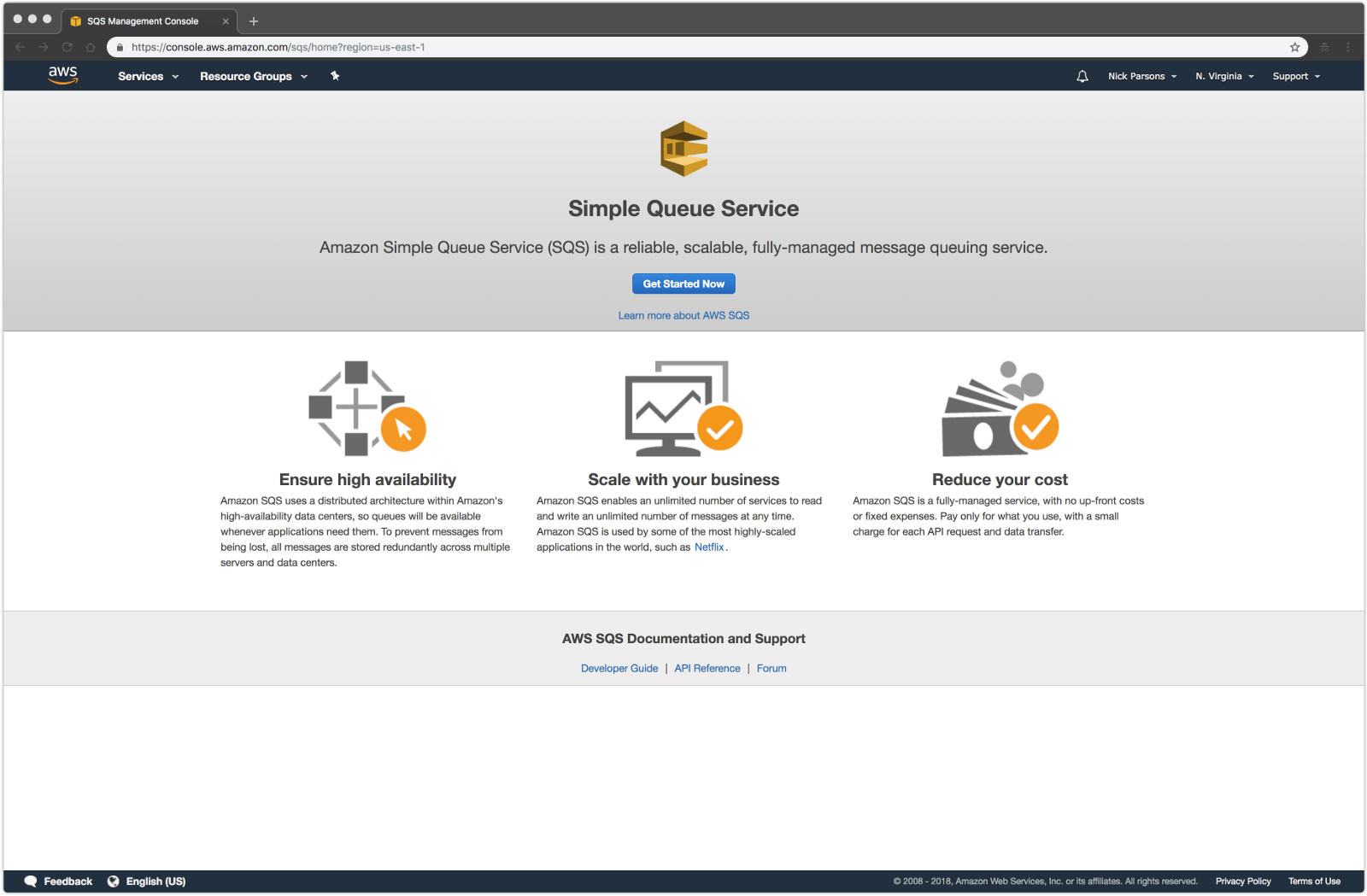 设置AWS SQS非常简单。 登录后,转到SQS页面。 从那里,我们可以选择创建一个新队列。 点击“立即开始”按钮。